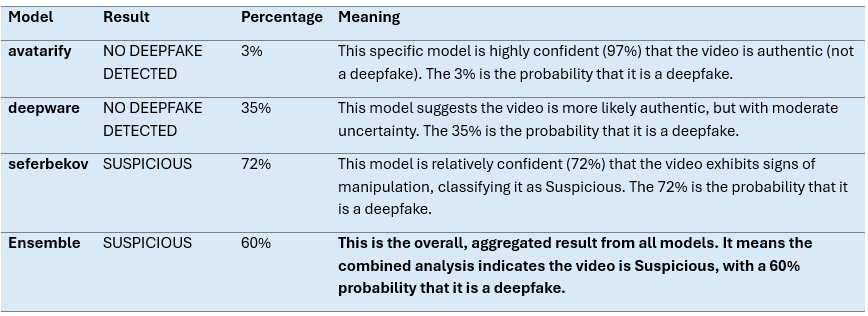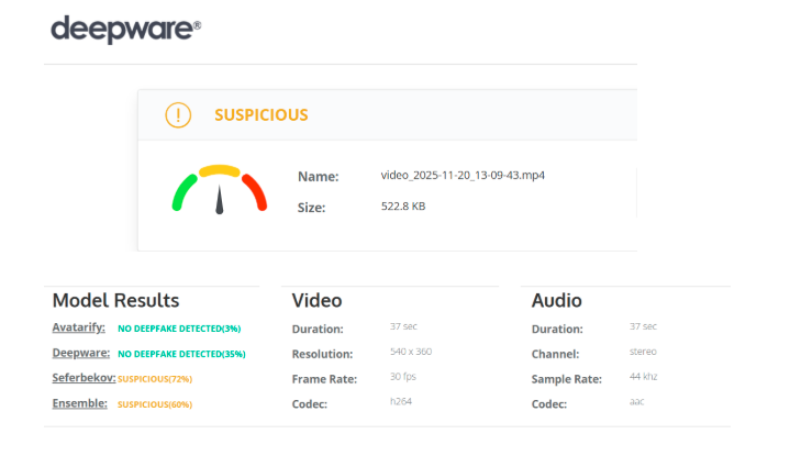 MFC used Deepware.ai to analyze the video. The tool classified it as “SUSPICIOUS,” with a 60% likelihood of manipulation and only 40% likelihood of authenticity.