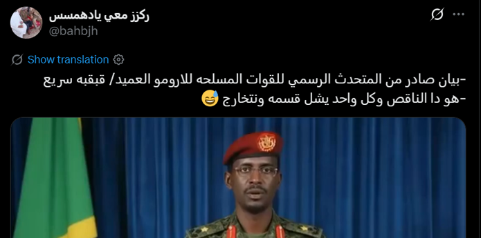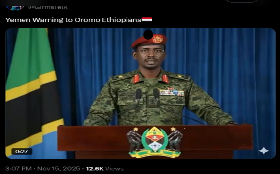 On November 9, 2025, a 37‑second clip circulated widely. It appeared with captions such as “Statement issued by the official spokesperson of the Armed Forces,” “Yemen warning to Oromo Ethiopians,” and “Official spokesperson for the Oromo in Yemen.” Versions in Arabic also appeared.