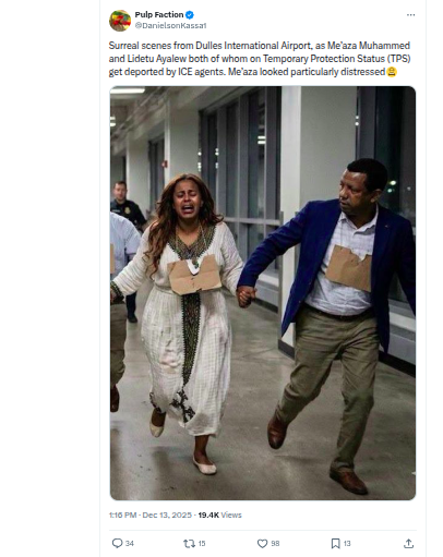 On December 13, 2025, an X account shared a dramatic post. It claimed ICE agents deported Meaza Mohammed and Lidetu Ayalew from Dulles International Airport. The post stated both individuals held Temporary Protected Status (TPS) in the United States.