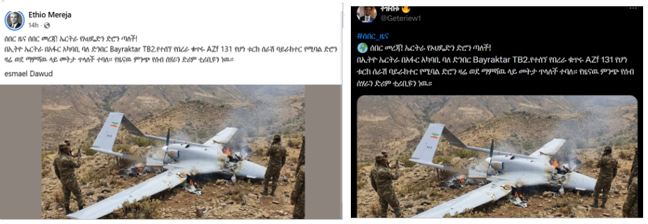 On March 25, 2026, a Facebook user named Esmael Dawed Endrise, who holds a verified blue badge and has more than 68,000 followers, shared an image as “Breaking News.” The user claimed that Eritrea had shot down an Ethiopian drone near the Ethio-Eritrea border. Before this article was published, the post garnered more than 1,500 reactions and 65 shares. Additionally, the same post was reshared on X (formerly Twitter) and Facebook by different users after the initial post went viral.