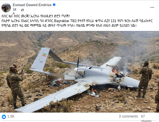 The Amharic caption of the post reads: “Breaking News! Breaking Information! Eritrea Shoots Down an OPDO Drone! A Turkish-made Bayraktar drone, flight number AZf 131, was shot down by Eritrea near the Ethio-Eritrea border in the Afar region this evening.”